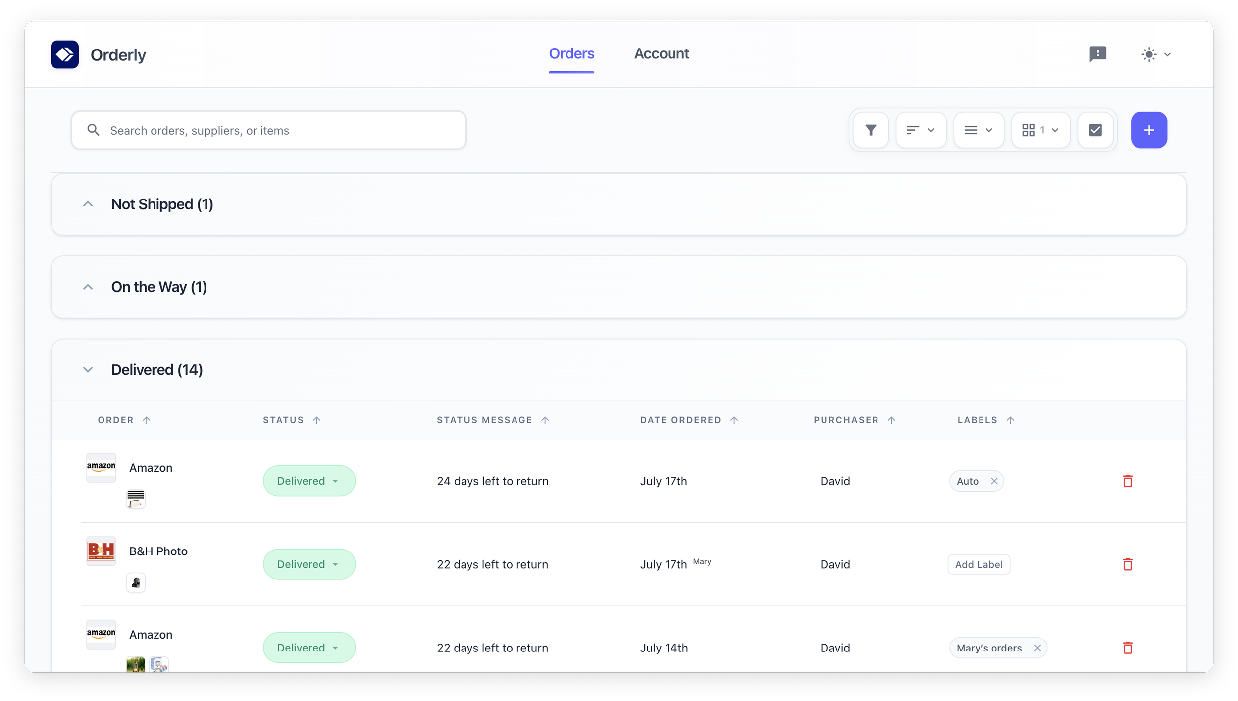 Orderly tracks every online order, from any website, automatically. Get delivery updates and return reminders with zero effort.